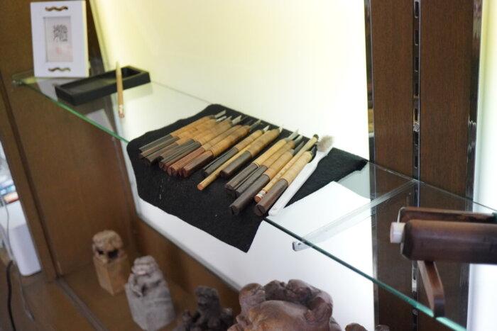 使い込まれた父の彫刻刀、印材、そして筆と硯。